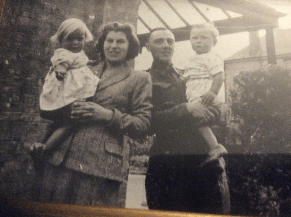 John Thomas en echtgenote Violet met hun tweeling in 1944, voordat hij overseas zou gaan. Jacky op de arm van haar moeder, John op de arm van zijn vader.