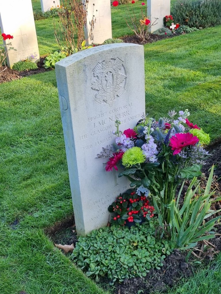 De eerste familie is die van Corporal John Mcneil Kerr. John kwam uit Schotland en was lid van The Glasgow Highlanders. Hij sneuvelde in de slag om de Roerdriehoek tussen de gehuchtjes Hontem en Schöndorf (Duitsland) op 23 januari 1945, slechts 24 jaar oud. Stichtingleden Bart en Ivo hadden het genoegen om de dochter en kleindochter van John rond te leiden over het slagveld en de plek waar hij sneuvelde te tonen aan de familieleden.